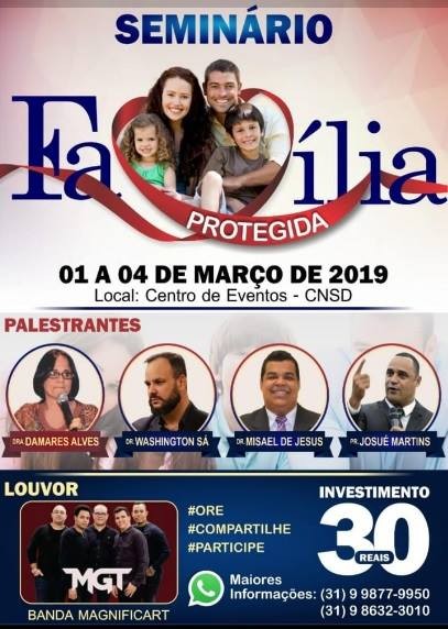 Acontece em Itabira de 01 a 04 de março, o Seminário Família O evento será no Salão de Eventos do Colégio Nossa Senhora das Dores, na Rua Santana, bairro Penha. [pro_ad_display_adzone id=”44899″ align=”right”]