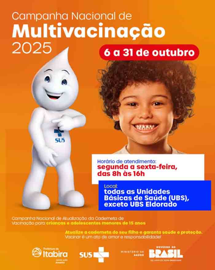 No dia 18 de outubro (sábado), Itabira participará do Dia D de Multivacinação com atendimento nas unidades de saúde. A mobilização tem como objetivo ampliar o acesso e garantir a vacinação de todas as crianças e adolescentes que não conseguirem comparecer durante a semana.