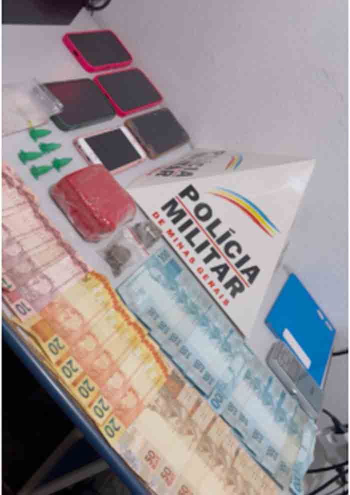 Foram apreendidos três tabletes de maconha, cinco pinos de cocaína, uma balança de precisão, um caderno com anotações do tráfico, materiais para embalar drogas, R$ 1.936,00 em dinheiro e cinco aparelhos celulares.