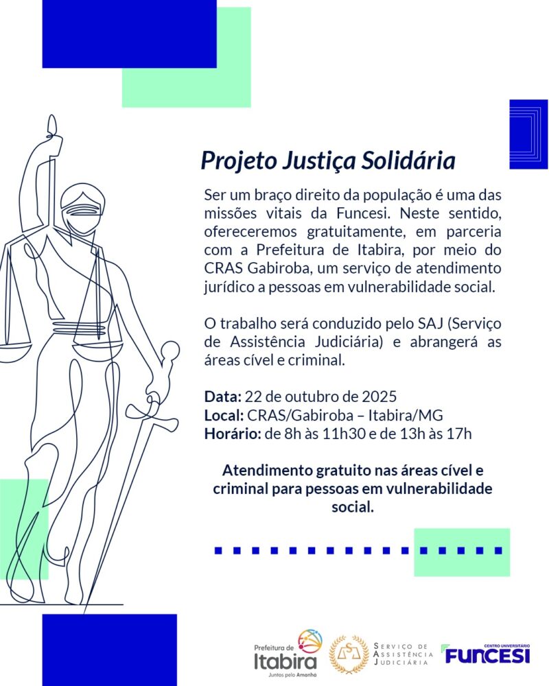 O Projeto Justiça Solidária é uma iniciativa da FUNCESI em parceria com a Secretaria Municipal de Assistência Social e acontecerá no dia 22/10/25, de 08 às 17 horas.